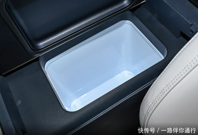 中央岛台面板经过重新布局,岛台下方采用镂空设计,方便收纳更多随身物品,最前方是50W手机无线充电面板,紧接着便是储物盒以及杯架,这片区域没有任何控制按键,中央扶手下方配备有车载冰箱,这也是当前比较受欢迎的一项配置,支持左右两侧开启,不过个人猜测冰箱这一配置大概率是顶配的专属,对此只能等官方公布信息后去证实了。